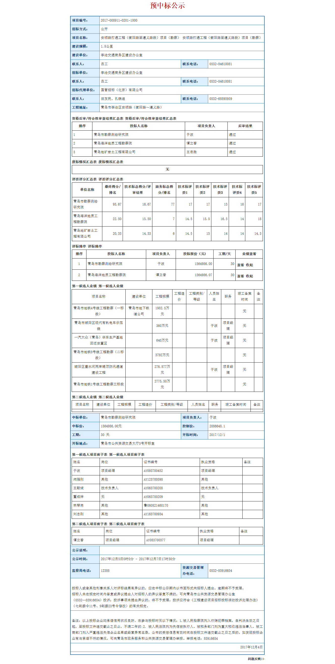安顺路打通工程(衡阳路至遵义路段)项目(勘察) 中标公示
