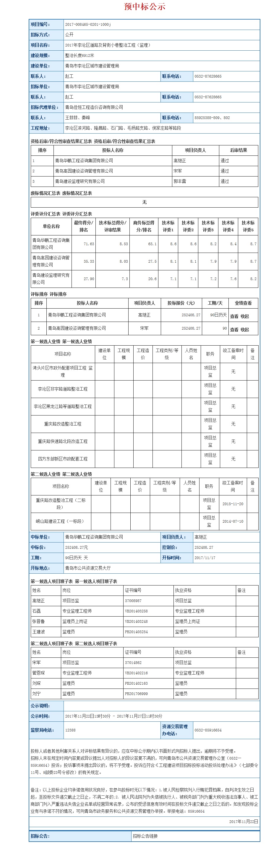 2017年李沧区道路及背街小巷整治工程(监理)中标公示